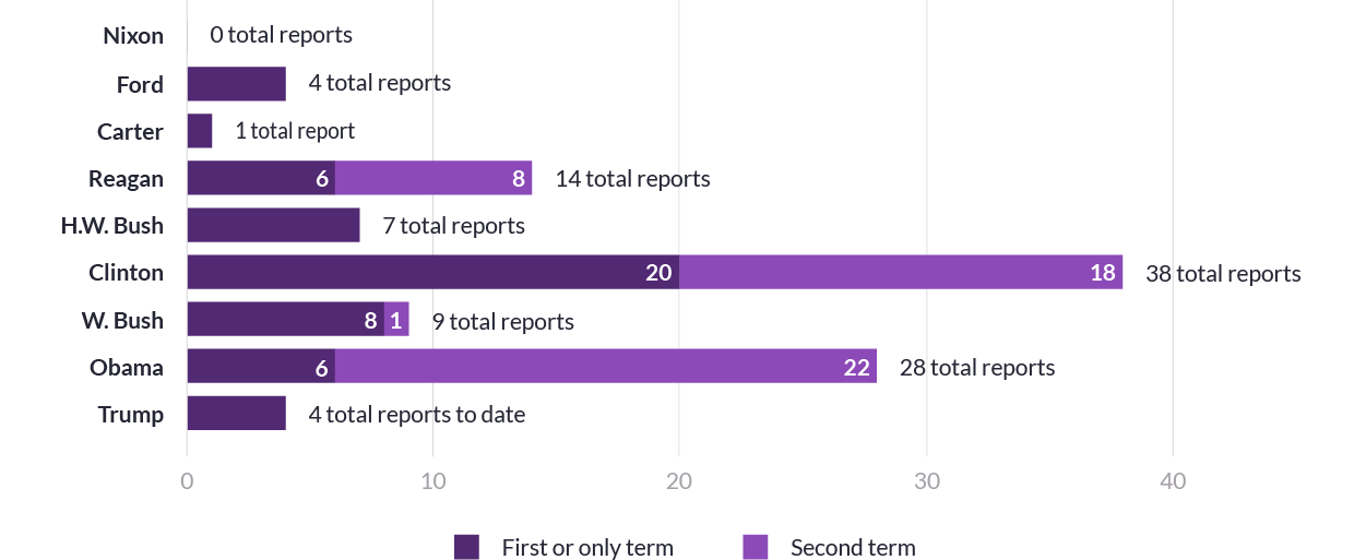 Figure 1. Number of 48-Hour Reports Per Presidential Term (Source: https://warpowers.lawandsecurity.org/findingsandanalysis/)