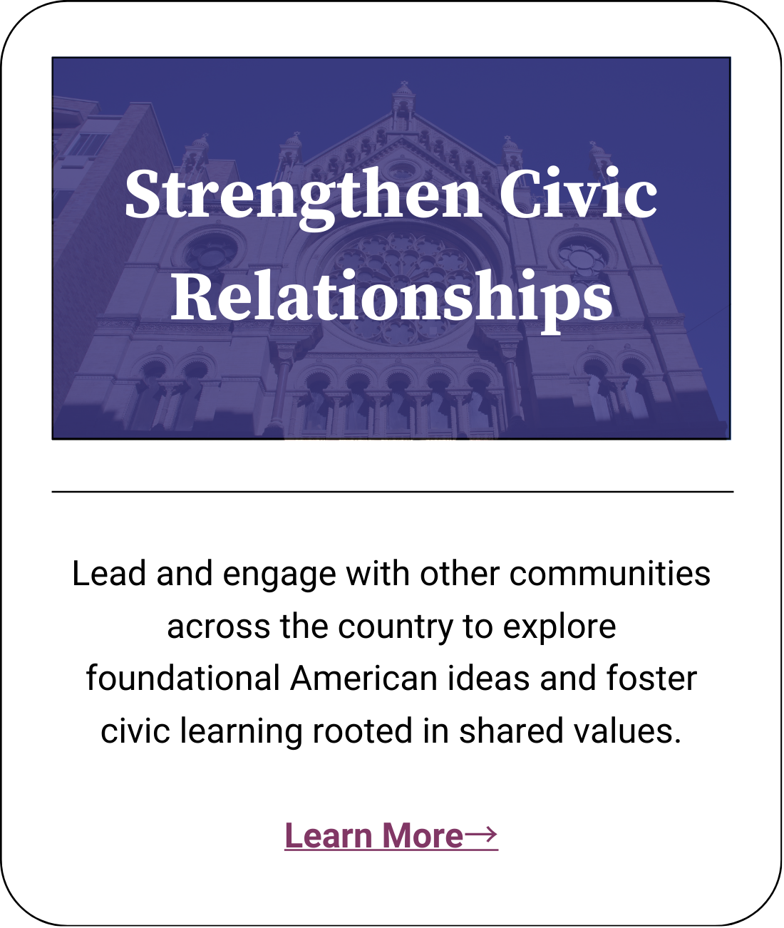 Democracy is not something you have, it is something you do. It depends on civic knowledge, relationships across difference, and a shared commitment to the institutions and principles that bind us together.